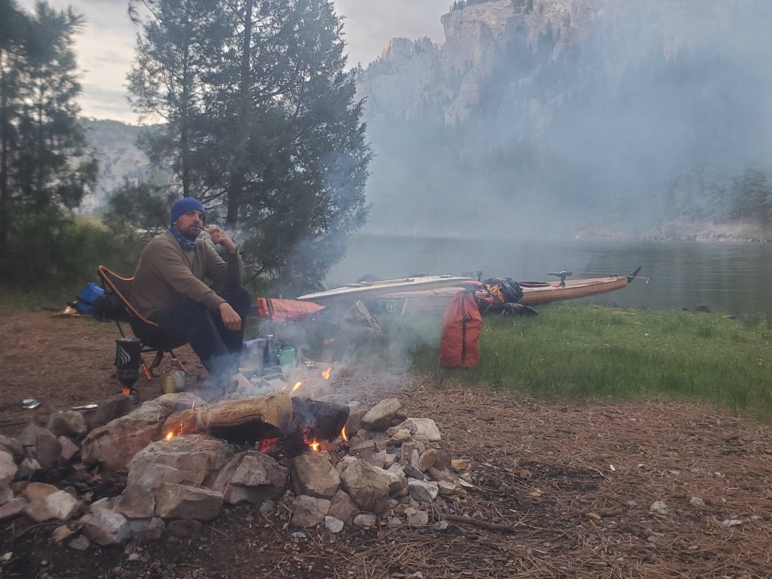 I even got to safely check off an item I’d been wanting to experience on my list: to see a bear. As we entered the canyon, halfway up one of the hillsides was a black bear with its cub. I got a pretty good look with my binoculars. We paddled a few miles into the canyon before finding what’s probably the best campsite I’ve ever stayed at. Jim and I set up camp, built a fire, enjoyed a few beers and some nips of whiskey, shared good conversation and some warm dinner, and were in bed before it even got dark.
