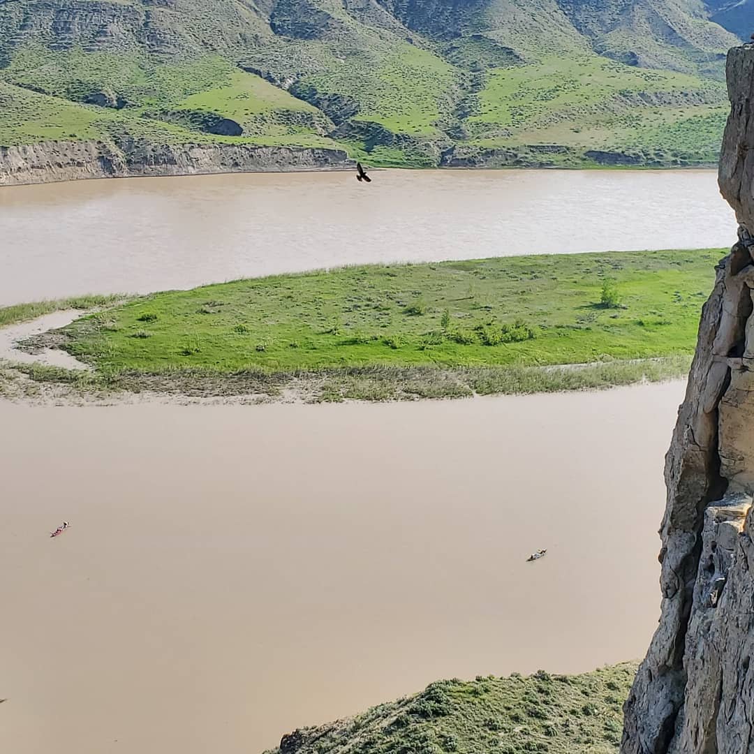 Currently, I am sitting at a picnic table at the campground at Judith Landing – at mile 88 of 149 in the Upper Missouri River Breaks National Monument. Just had a very satisfying dinner of dehydrated ham, beans, ramen and sauerkraut. Got a little nip of whiskey next to me, I found the Blues game 3 of the finals on the radio and just started a fire to keep the bugs away. It’s been a busy few days since Great Falls.Wednesday, my plan was to prep my gear and food for the coming weeks, then catch a ride from Great Falls to below the Falls with my shuttle at around 2:30pm. Knowing that I was going to need to bring a lot more water with me than I had during the early part of the trip, I had to pack everything as efficiently as possible, using every square inch wisely. Around 11:30 I got a call from a local Montana number and answered. It was Casey at local TV station KRTV. When I stopped into Montana River Outfitters the day before to get some advice on the trip, the owner Craig apparently called a few contacts in the media and told them about my trip.I walked around the corner to Miss Kitty’s coffee shop and met the reporter who did a pretty quick interview. I told her she was more than welcome to spice things up with any photos or video from my web site or Instagram.