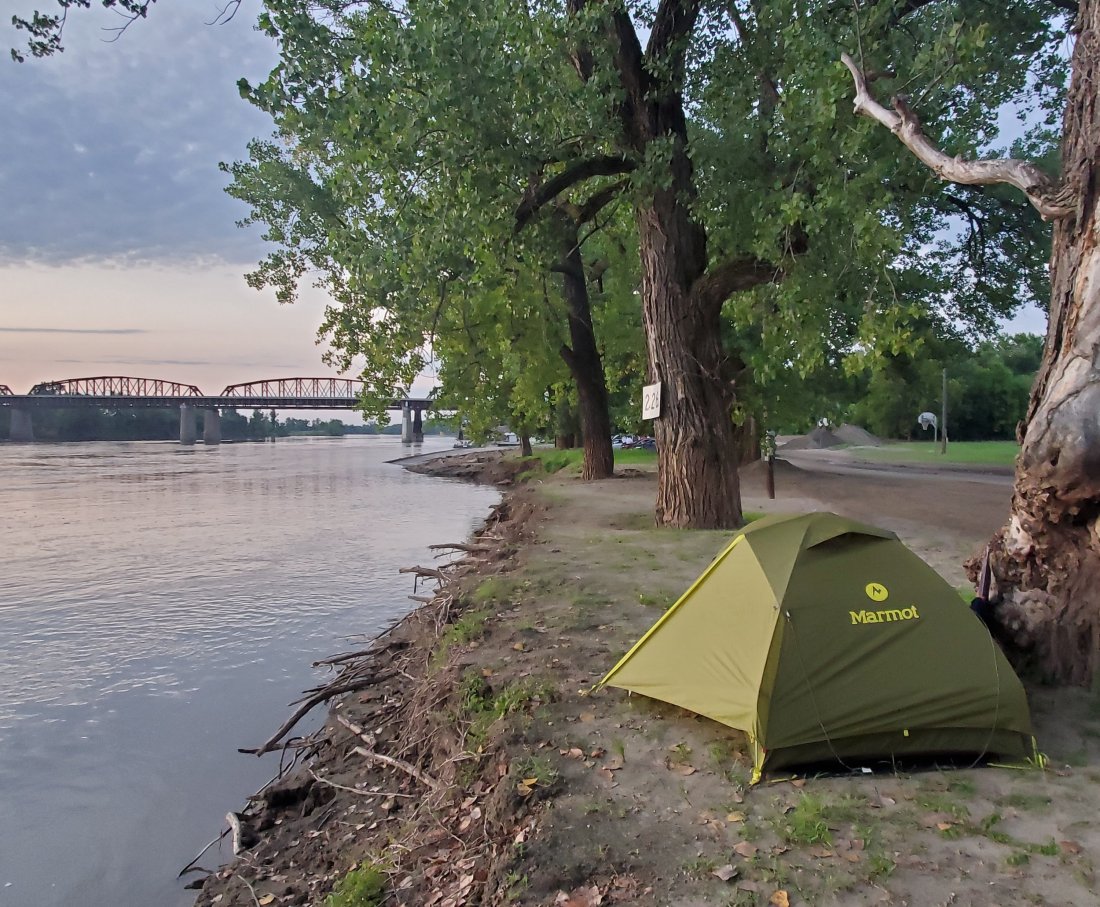 Scott and I returned to The Smoking Mule, where we enjoyed some food and drinks and volleyed river stories back and forth, his vast experience dwarfing my short, uneventful time on the river so far. Back to camp, we sat around in the dark getting chewed up my mosquitos, telling more stories before retiring for the night. It didn’t last very long. At 5:30am, the tornado sirens blared. I peaked out into the faint light of the early morning, it was windy, the waves were big on the lake, and the cottonwoods above us were bending. I turned on my phone to check the radar: storms moving in but not an obvious tornado. Scott and I got out of our tents, secured some of our gear, then decided to walk over to the bathroom/shower building for shelter. Lots of other campers left their RVs to do the same. When the front hit, we got inside the women’s bathroom, groggily acknowledging the other campers and waiting for the storm to pass. The wind raged and the rain poured down. After a good 45 minutes, we emerged and walked back to our camp. Branches were down everwhere. It didn’t look like there was significant damage. Arriving at our tents, Scott’s was leveled and sitting in 3 inches of water.